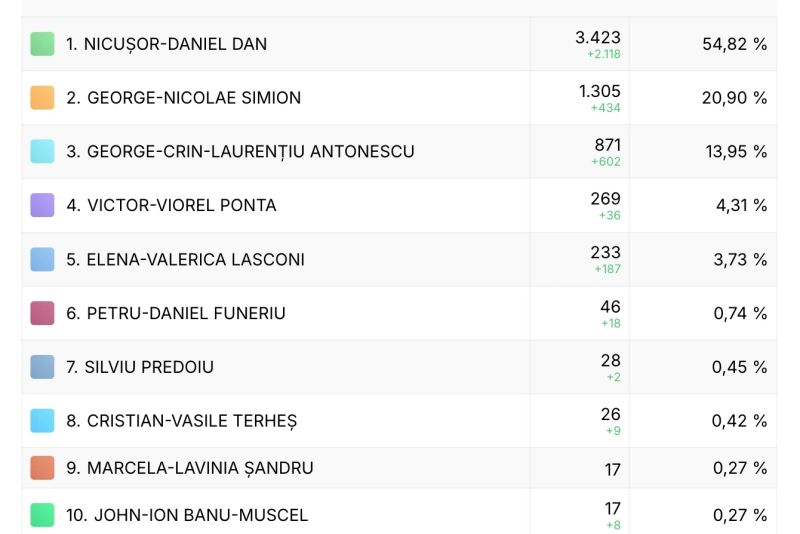 Datele transmise de Biroul Electoral Central reflectă numărătoarea voturilor pe măsură ce procesele-verbale ajung din secțiile de votare.