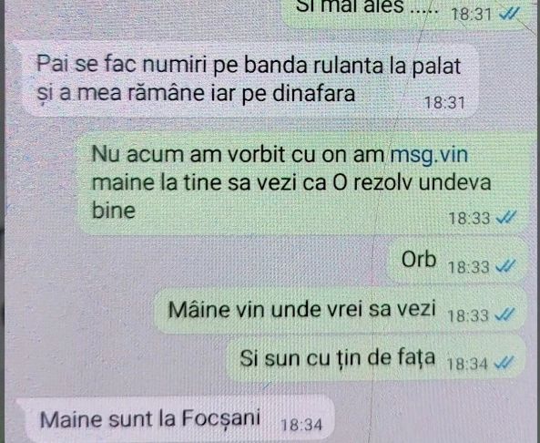 - Da, doamnă. Ați văzut, doamnă, că ăla, doamnă, Costel ăla, doamnă, Călin nu vrea să dea 100 de milioane și eu am dat 500 de milioane, doamnă. Nu mi-am scos nici banii mei, am investit 700 de milioane. Eu vă arăt facturi. Mie îmi trebuie, doamnă, sunt bănuții mei. Vă rog să-i transmiteți urgent ca să putem scoate bănuții mei. Că nu merge așa, doamnă. Sunt banii mei munciți, n-am păcălit pe nimeni, nu, doamnă. Îmi vreau bănuții mei înapoi! Când vine Maria, mi-a zis că rezolvă o doamnă, să rezolve! Dar îmi dați 7.000 de euro, doamnă, da? Dintre care mi-a zis, doamnă, că a dat 4.000 de la ministru în coș, da? I-am dat 7.000 mii, doamnă, 70 de milioane, doamnă, v-am dat, doamnă, pentru directorul, pentru curte. Așa este?