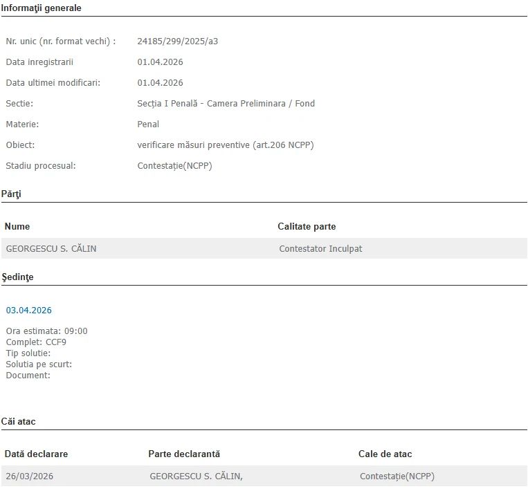 Călin Georgescu se va prezenta vineri la primele ore ale dimineții la Tribunalul București, după ce judecătorii l-au convocat pentru contestația asupra măsurii preventive de control judiciar.