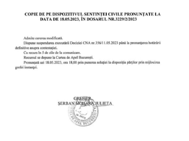 Victorie pentru postul nostru de televiziune Realitatea PLUS! Instanța a decis, astăzi, suspendarea deciziei CNA de a opri emisia timp de 10 minute, în intervalul 19:00-19:10.